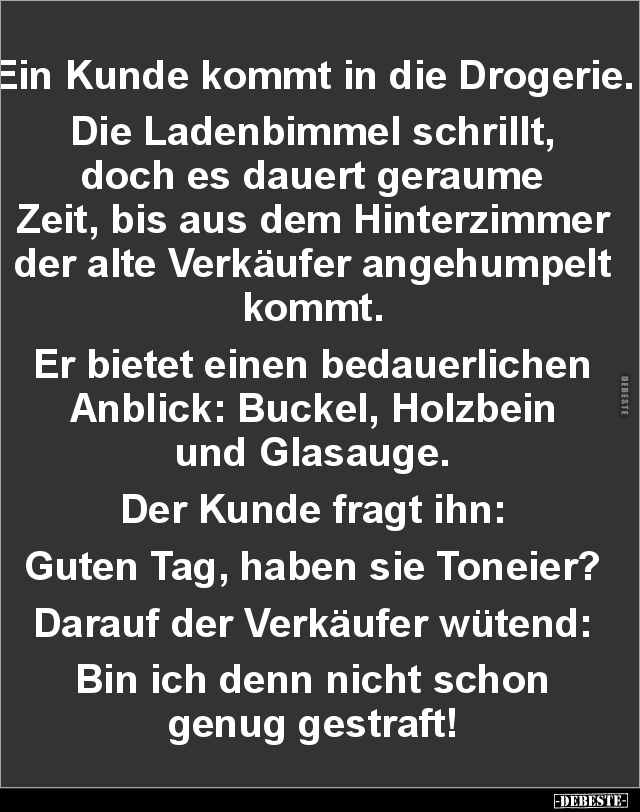 Ein Kunde kommt in die Drogerie. Die Ladenbimmel schrillt, doch es dauert geraume Zeit, bis aus dem Hinterzimmer der alte Verkäufer angehumpelt kommt. Er bietet einen bedauerlichen Anblick: Buckel, Holzbein und Glasauge. Der Kunde fragt ihn: Guten Tag, haben sie Toneier? Darauf der Verkäufer wütend: Bin ich denn nicht schon genug gestraft!