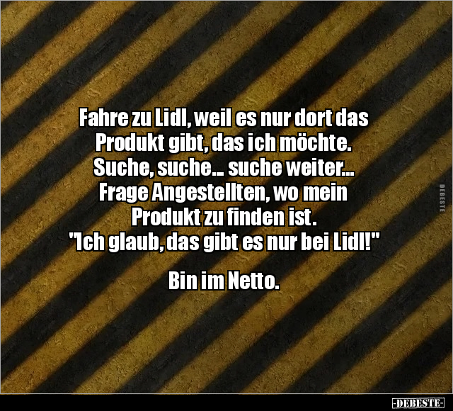 Fahre zu Lidl, weil es nur dort das Produkt gibt, das ich möchte. Suche, suche... suche weiter... Frage Angestellten, wo mein Produkt zu finden ist. "Ich glaub, das gibt es nur bei Lidl!" Bin im Netto.