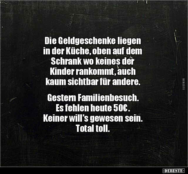 Die Geldgeschenke liegen in der Küche, oben auf dem Schrank wo keines der Kinder rankommt, auch kaum sichtbar für andere. Gestern Familienbesuch. Es fehlen heute 50€. Keiner will’s gewesen sein. Total toll.