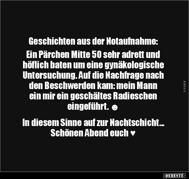 Geschichten aus der Notaufnahme: Ein Pärchen Mitte 50 sehr adrett und höflich baten um eine gynäkologische Untersuchung. Auf die Nachfrage nach den Beschwerden kam: mein Mann ein mir ein geschältes Radieschen eingeführt. ☻ In diesem Sinne auf zur Nachtschicht... Schönen Abend euch ♥