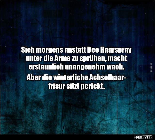 Sich morgens anstatt Deo Haarspray unter die Arme zu sprühen, macht erstaunlich unangenehm wach. Aber die winterliche Achselhaar- frisur sitzt perfekt.