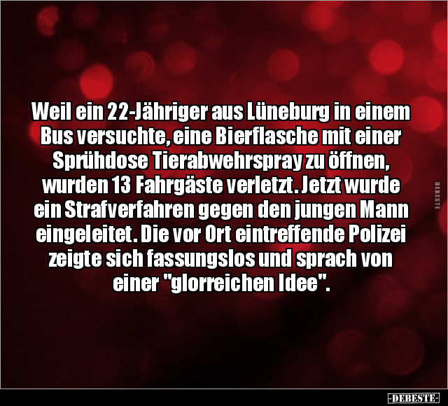 Weil ein 22-Jähriger aus Lüneburg in einem Bus versuchte, eine Bierflasche mit einer Sprühdose Tierabwehrspray zu öffnen, wurden 13 Fahrgäste verletzt. Jetzt wurde ein Strafverfahren gegen den jungen Mann eingeleitet. Die vor Ort eintreffende Polizei zeigte sich fassungslos und sprach von einer "glorreichen Idee".