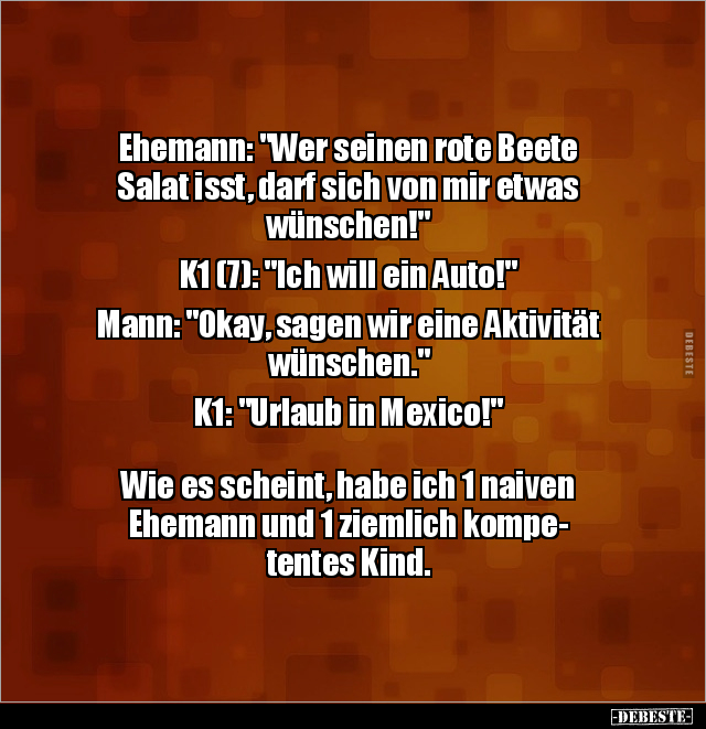 Ehemann: "Wer seinen rote Beete Salat isst, darf sich von mir etwas wünschen!" K1 (7): "Ich will ein Auto!" Mann: "Okay, sagen wir eine Aktivität wünschen." K1: "Urlaub in Mexico!" Wie es scheint, habe ich 1 naiven Ehemann und 1 ziemlich kompe- tentes Kind.