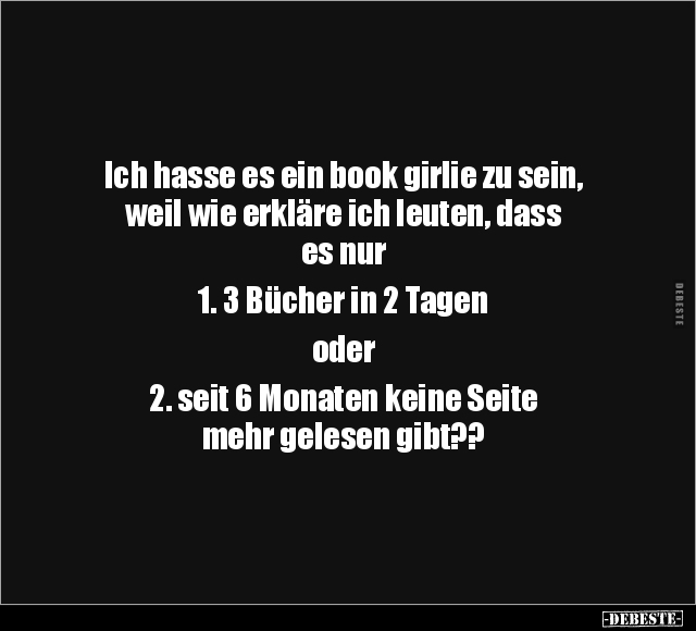 Ich hasse es ein book girlie zu sein, weil wie erkläre ich leuten, dass es nur 1. 3 Bücher in 2 Tagen oder 2. seit 6 Monaten keine Seite mehr gelesen gibt??