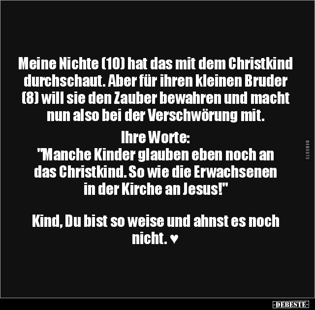 Meine Nichte (10) hat das mit dem Christkind durchschaut. Aber für ihren kleinen Bruder (8) will sie den Zauber bewahren und macht nun also bei der Verschwörung mit. Ihre Worte: "Manche Kinder glauben eben noch an das Christkind. So wie die Erwachsenen in der Kirche an Jesus!" Kind, Du bist so weise und ahnst es noch nicht. ♥