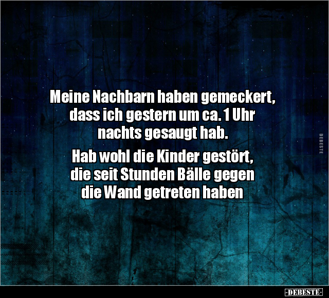Meine Nachbarn haben gemeckert, dass ich gestern um ca. 1 Uhr nachts gesaugt hab. Hab wohl die Kinder gestört, die seit Stunden Bälle gegen die Wand getreten haben