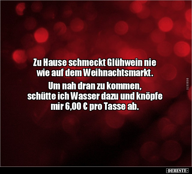 Zu Hause schmeckt Glühwein nie wie auf dem Weihnachtsmarkt. Um nah dran zu kommen, schütte ich Wasser dazu und knöpfe mir 6,00 € pro Tasse ab.