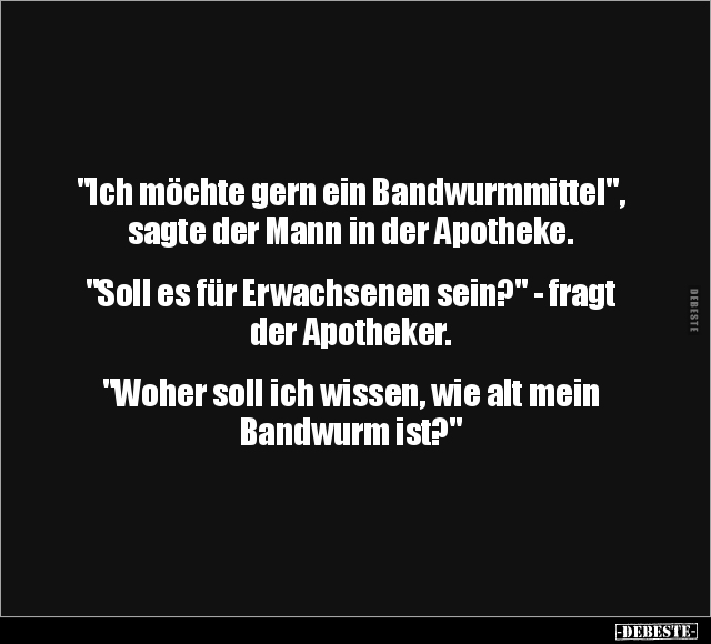 "Ich möchte gern ein Bandwurmmittel", sagte der Mann in der Apotheke. "Soll es für Erwachsenen sein?" - fragt der Apotheker. "Woher soll ich wissen, wie alt mein Bandwurm ist?"