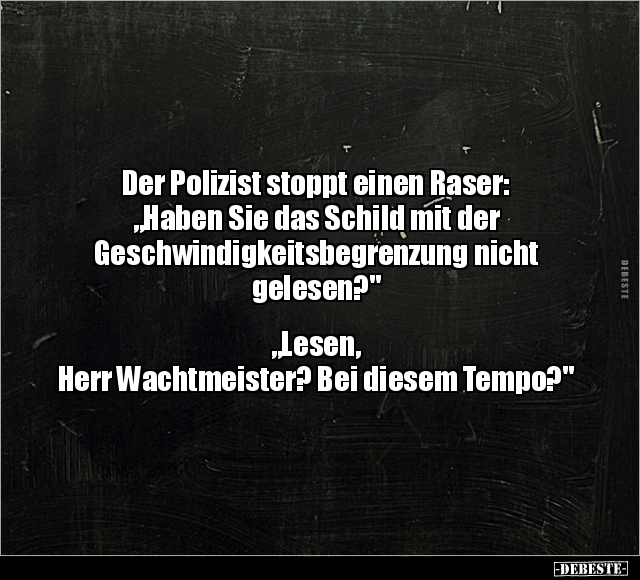 Der Polizist stoppt einen Raser: „Haben Sie das Schild mit der Geschwindigkeitsbegrenzung nicht gelesen?" „Lesen, Herr Wachtmeister? Bei diesem Tempo?"