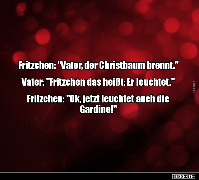 Fritzchen: "Vater, der Christbaum brennt." Vater: "Fritzchen das heißt: Er leuchtet." Fritzchen: "Ok, jetzt leuchtet auch die Gardine!"