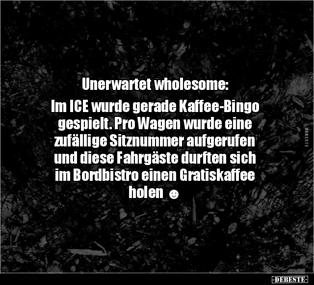 Unerwartet wholesome: Im ICE wurde gerade Kaffee-Bingo gespielt. Pro Wagen wurde eine zufällige Sitznummer aufgerufen und diese Fahrgäste durften sich im Bordbistro einen Gratiskaffee holen ☻