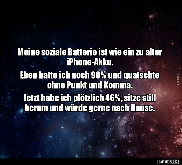 Meine soziale Batterie ist wie ein zu alter iPhone-Akku. Eben hatte ich noch 90% und quatschte ohne Punkt und Komma. Jetzt habe ich plötzlich 46%, sitze still herum und würde gerne nach Hause.