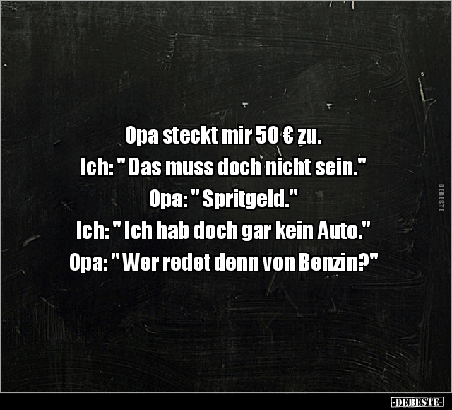 Opa steckt mir 50 € zu. Ich: " Das muss doch nicht sein." Opa: " Spritgeld." Ich: " Ich hab doch gar kein Auto." Opa: " Wer redet denn von Benzin?"