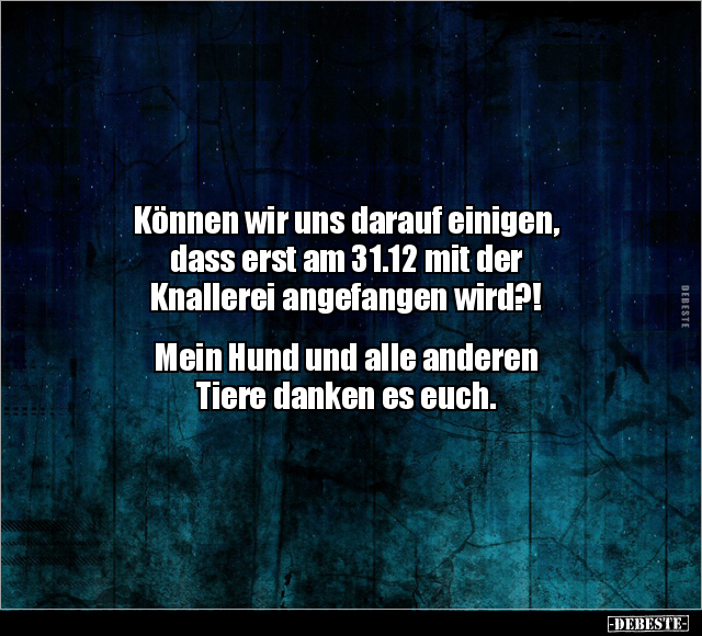 Können wir uns darauf einigen, dass erst am 31.12 mit der Knallerei angefangen wird?! Mein Hund und alle anderen Tiere danken es euch.