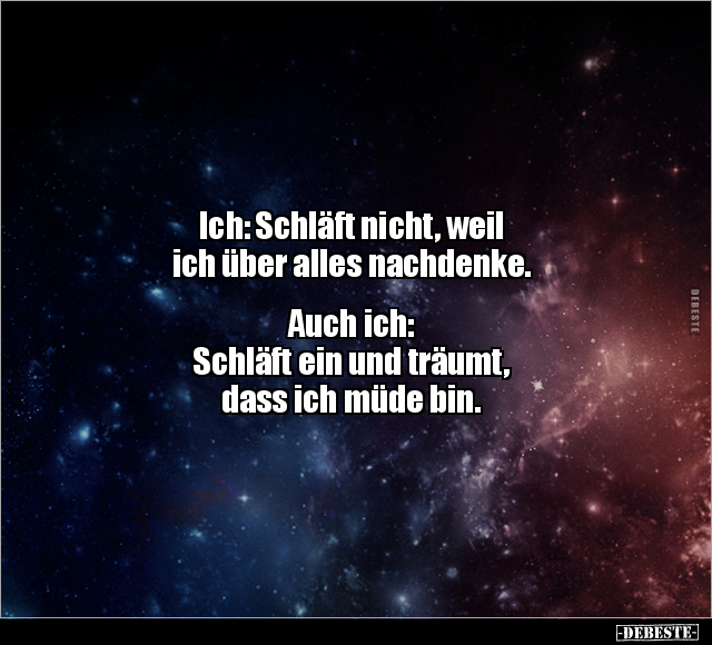 Ich: Schläft nicht, weil ich über alles nachdenke. Auch ich: Schläft ein und träumt, dass ich müde bin.