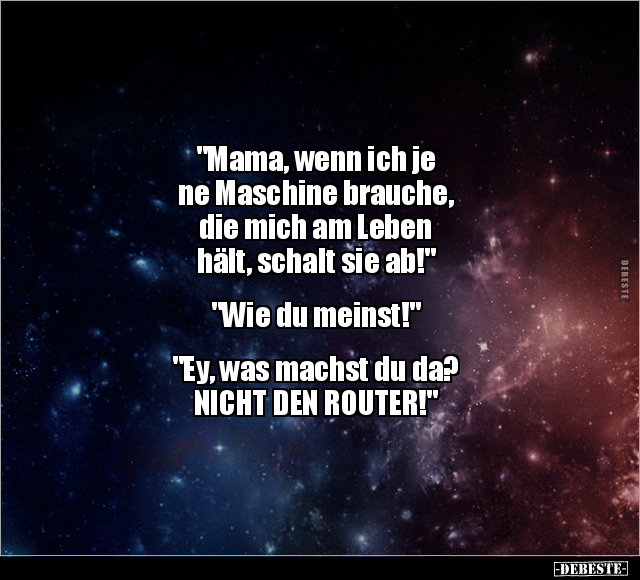 "Mama, wenn ich je ne Maschine brauche, die mich am Leben hält, schalt sie ab!" "Wie du meinst!" "Ey, was machst du da? NICHT DEN ROUTER!"