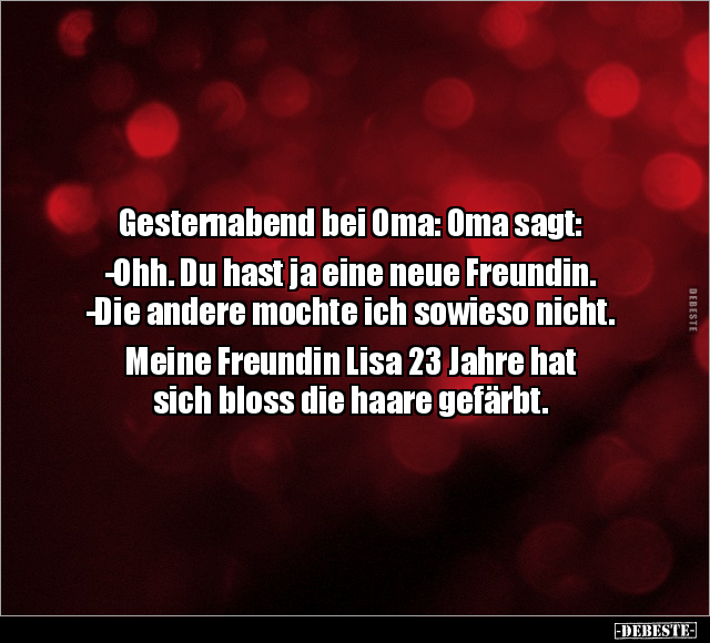 Gesternabend bei Oma: 0ma sagt: -Ohh. Du hast ja eine neue Freundin. -Die andere mochte ich sowieso nicht. Meine Freundin Lisa 23 Jahre hat sich bloss die haare gefärbt.
