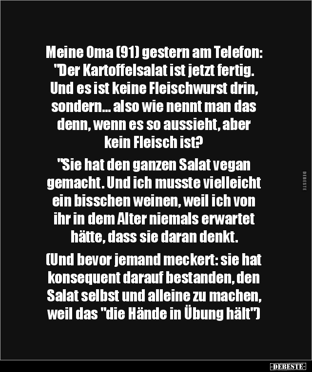 Meine Oma (91) gestern am Telefon: "Der Kartoffelsalat ist jetzt fertig. Und es ist keine Fleischwurst drin, sondern... also wie nennt man das denn, wenn es so aussieht, aber kein Fleisch ist? "Sie hat den ganzen Salat vegan gemacht. Und ich musste vielleicht ein bisschen weinen, weil ich von ihr in dem Alter niemals erwartet hätte, dass sie daran denkt. (Und bevor jemand meckert: sie hat konsequent darauf bestanden, den Salat selbst und alleine zu machen, weil das "die Hände in Übung hält")