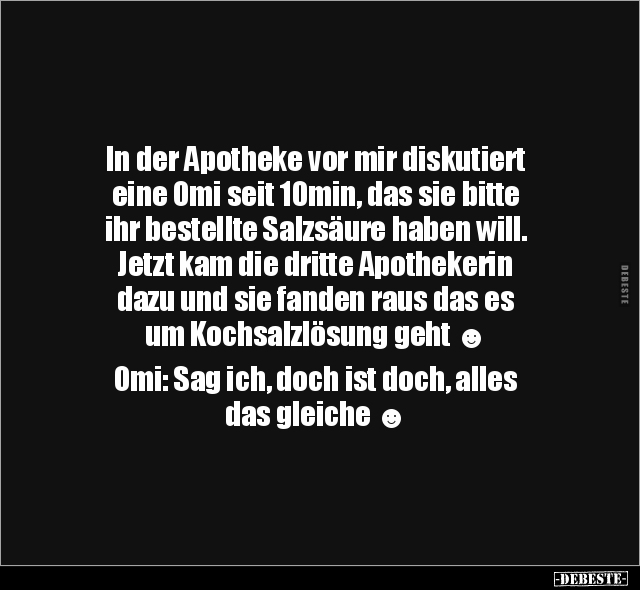 In der Apotheke vor mir diskutiert eine Omi seit 10min, das sie bitte ihr bestellte Salzsäure haben will. Jetzt kam die dritte Apothekerin dazu und sie fanden raus das es um Kochsalzlösung geht ☻ Omi: Sag ich, doch ist doch, alles das gleiche ☻