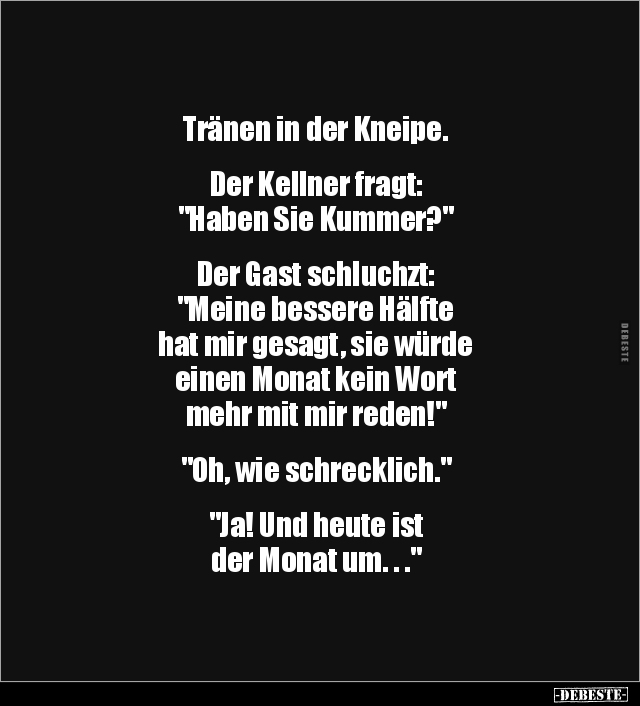 Tränen in der Kneipe. Der Kellner fragt: "Haben Sie Kummer?" Der Gast schluchzt: "Meine bessere Hälfte hat mir gesagt, sie würde einen Monat kein Wort mehr mit mir reden!" "Oh, wie schrecklich." "Ja! Und heute ist der Monat um. . ."