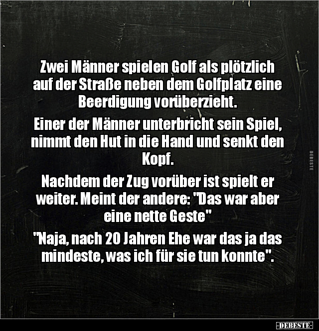 Zwei Männer spielen Golf als plötzlich auf der Straße neben dem Golfplatz eine Beerdigung vorüberzieht. Einer der Männer unterbricht sein Spiel, nimmt den Hut in die Hand und senkt den Kopf. Nachdem der Zug vorüber ist spielt er weiter. Meint der andere: "Das war aber eine nette Geste" "Naja, nach 20 Jahren Ehe war das ja das mindeste, was ich für sie tun konnte".