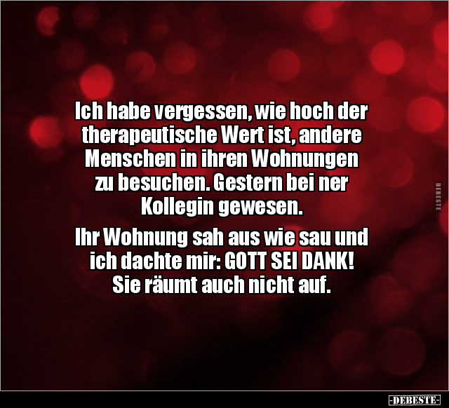 Ich habe vergessen, wie hoch der therapeutische Wert ist, andere Menschen in ihren Wohnungen zu besuchen. Gestern bei ner Kollegin gewesen. Ihr Wohnung sah aus wie sau und ich dachte mir: GOTT SEI DANK! Sie räumt auch nicht auf.