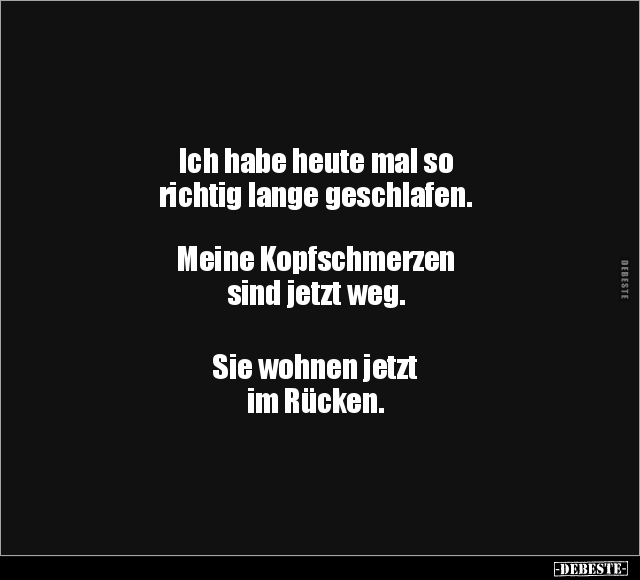 Ich habe heute mal so richtig lange geschlafen. Meine Kopfschmerzen sind jetzt weg. Sie wohnen jetzt im Rücken.