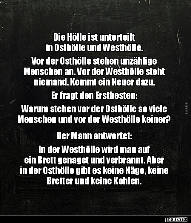 Die Hölle ist unterteilt in Osthölle und Westhölle. Vor der Osthölle stehen unzählige Menschen an. Vor der Westhölle steht niemand. Kommt ein Neuer dazu. Er fragt den Erstbesten: Warum stehen vor der Osthölle so viele Menschen und vor der Westhölle keiner? Der Mann antwortet: In der Westhölle wird man auf ein Brett genaget und verbrannt. Aber in der Osthölle gibt es keine Näge, keine Bretter und keine Kohlen.