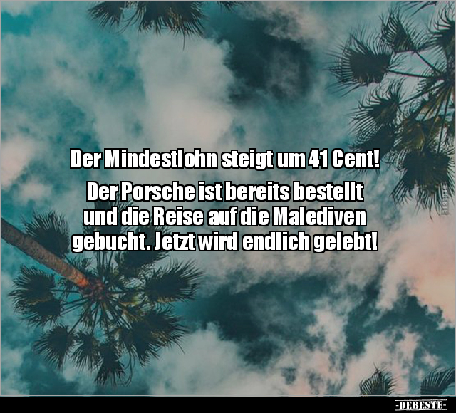 Der Mindestlohn steigt um 41 Cent! Der Porsche ist bereits bestellt und die Reise auf die Malediven gebucht. Jetzt wird endlich gelebt!
