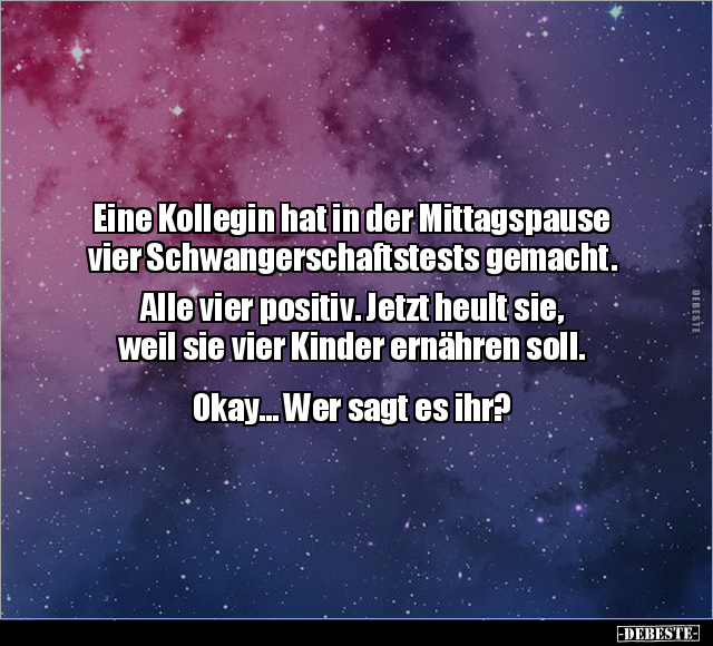 Eine Kollegin hat in der Mittagspause vier Schwangerschaftstests gemacht. Alle vier positiv. Jetzt heult sie, weil sie vier Kinder ernähren soll. Okay... Wer sagt es ihr?