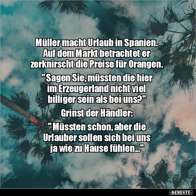 Müller macht Urlaub in Spanien. Auf dem Markt betrachtet er zerknirscht die Preise für Orangen. " Sagen Sie, müssten die hier im Erzeugerland nicht viel billiger sein als bei uns?" Grinst der Händler: " Müssten schon, aber die Urlauber sollen sich bei uns ja wie zu Hause fühlen..."