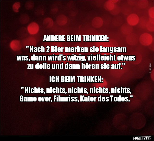 ANDERE BEIM TRINKEN: " Nach 2 Bier merken sie langsam was, dann wird’s witzig, vielleicht etwas zu dolle und dann hören sie auf." ICH BEIM TRINKEN: " Nichts, nichts, nichts, nichts, nichts, Game over, Filmriss, Kater des Todes."