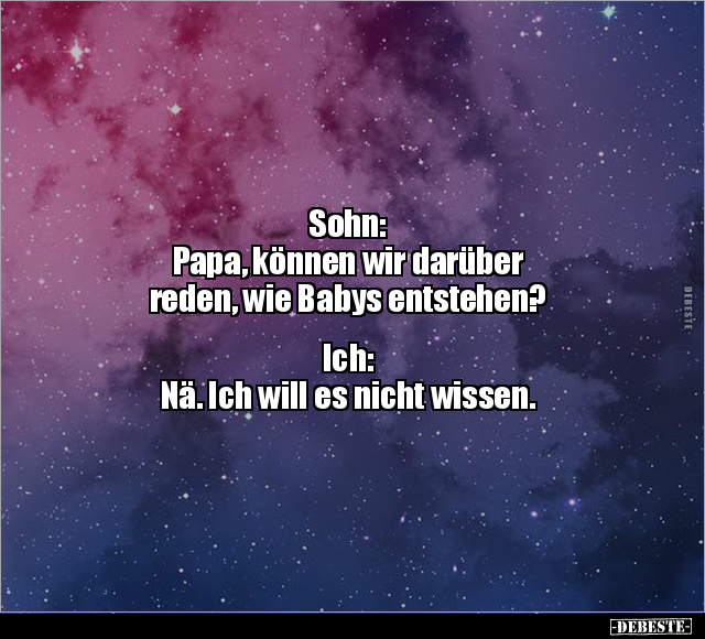 Sohn: Papa, können wir darüber reden, wie Babys entstehen? Ich: Nä. Ich will es nicht wissen.