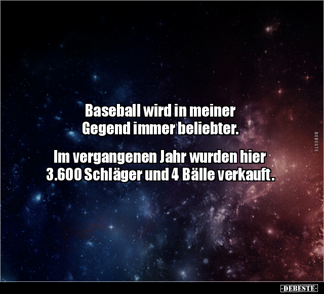 Baseball wird in meiner Gegend immer beliebter. Im vergangenen Jahr wurden hier 3.600 Schläger und 4 Bälle verkauft.