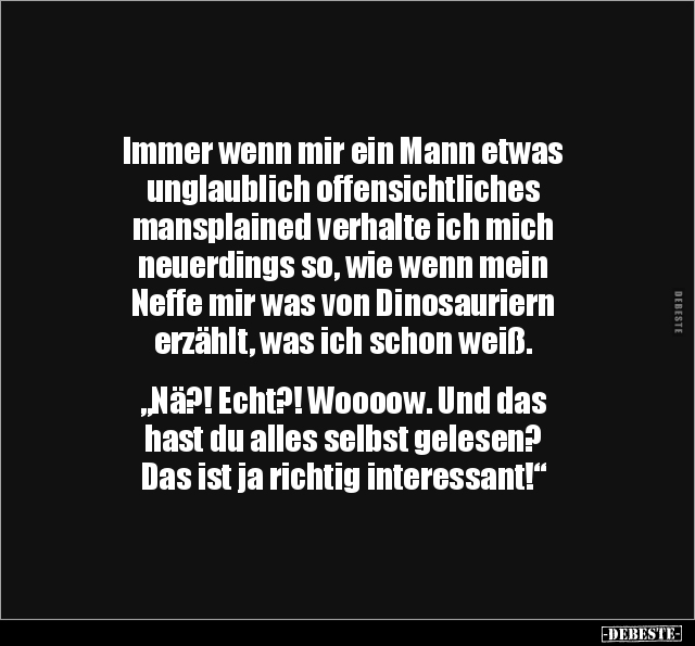 Immer wenn mir ein Mann etwas unglaublich offensichtliches mansplained verhalte ich mich neuerdings so, wie wenn mein Neffe mir was von Dinosauriern erzählt, was ich schon weiß. „Nä?! Echt?! Woooow. Und das hast du alles selbst gelesen? Das ist ja richtig interessant!“