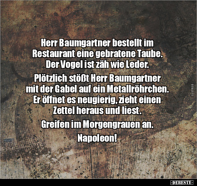Herr Baumgartner bestellt im Restaurant eine gebratene Taube. Der Vogel ist zäh wie Leder. Plötzlich stößt Herr Baumgartner mit der Gabel auf ein Metallröhrchen. Er öffnet es neugierig, zieht einen Zettel heraus und liest. Greifen im Morgengrauen an. Napoleon!