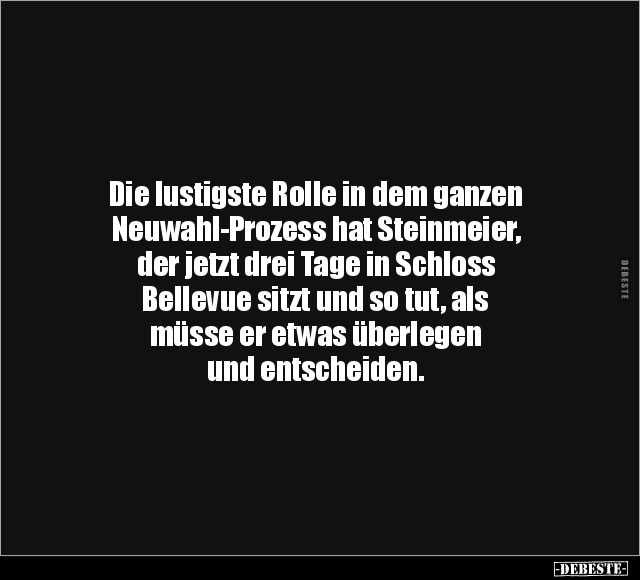 Die lustigste Rolle in dem ganzen Neuwahl-Prozess hat Steinmeier, der jetzt drei Tage in Schloss Bellevue sitzt und so tut, als müsse er etwas überlegen und entscheiden.