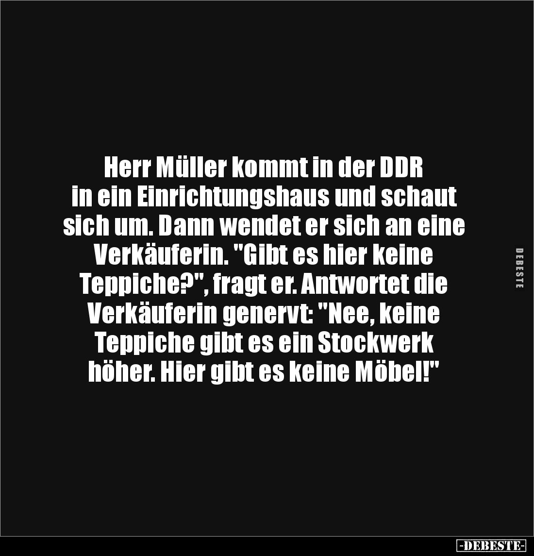 Herr Müller kommt in der DDR in ein Einrichtungshaus und schaut sich um. Dann wendet er sich an eine Verkäuferin. "Gibt es hier keine Teppiche?", fragt er. Antwortet die Verkäuferin genervt: "Nee, keine Teppiche gibt es ein Stockwerk höher. Hier gibt es keine Möbel!"