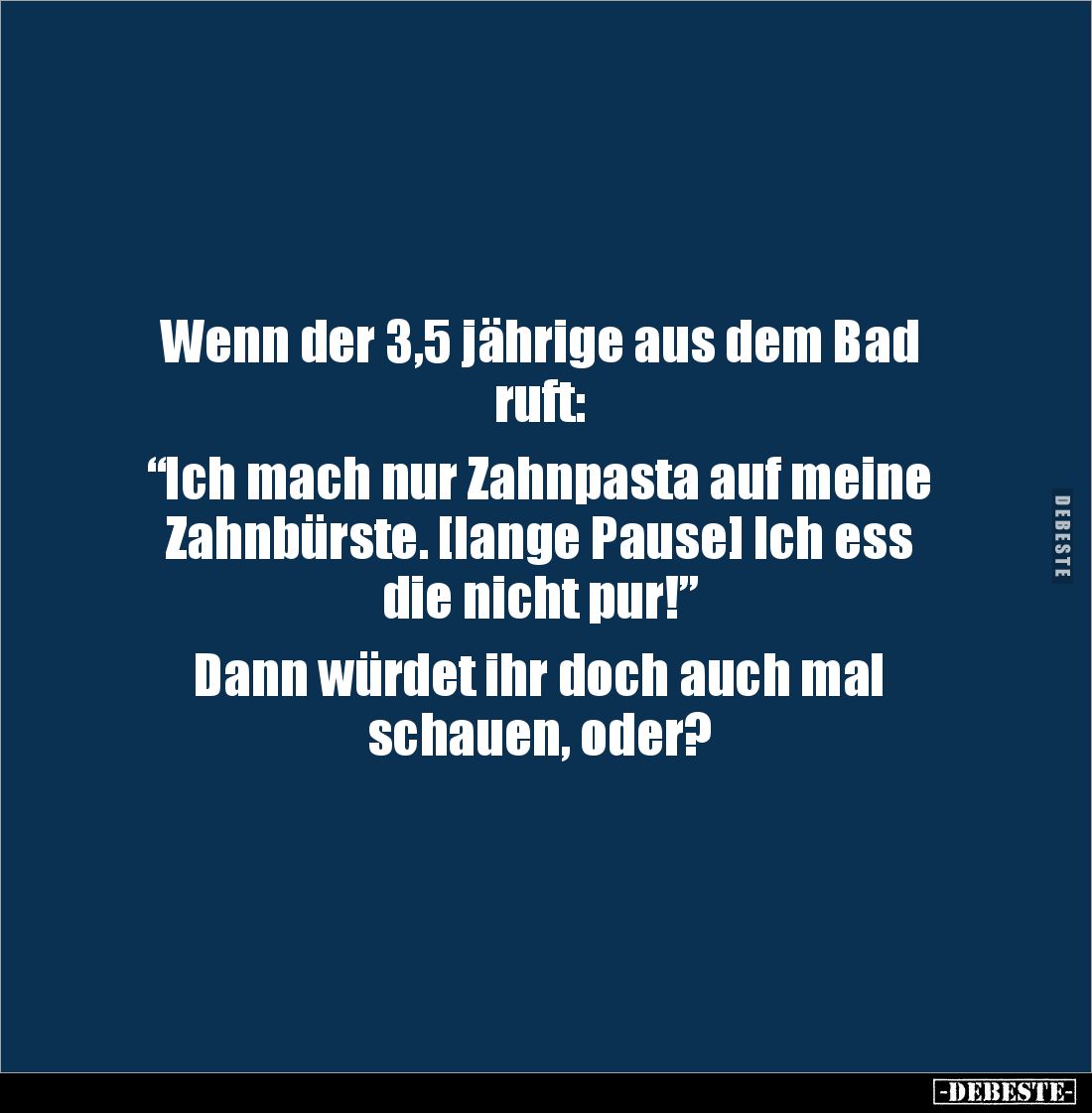 Wenn der 3,5 jährige aus dem Bad ruft: “Ich mach nur Zahnpasta auf meine Zahnbürste. [lange Pause] Ich ess die nicht pur!” Dann würdet ihr doch auch mal schauen, oder?