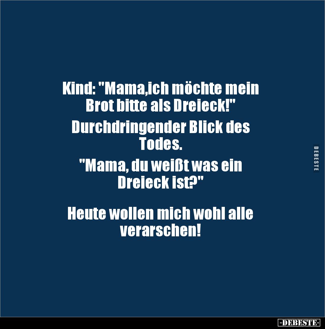 Kind: "Mama,ich möchte mein Brot bitte als Dreieck!" Durchdringender Blick des Todes. "Mama, du weißt was ein Dreieck ist?" Heute wollen mich wohl alle verarschen!