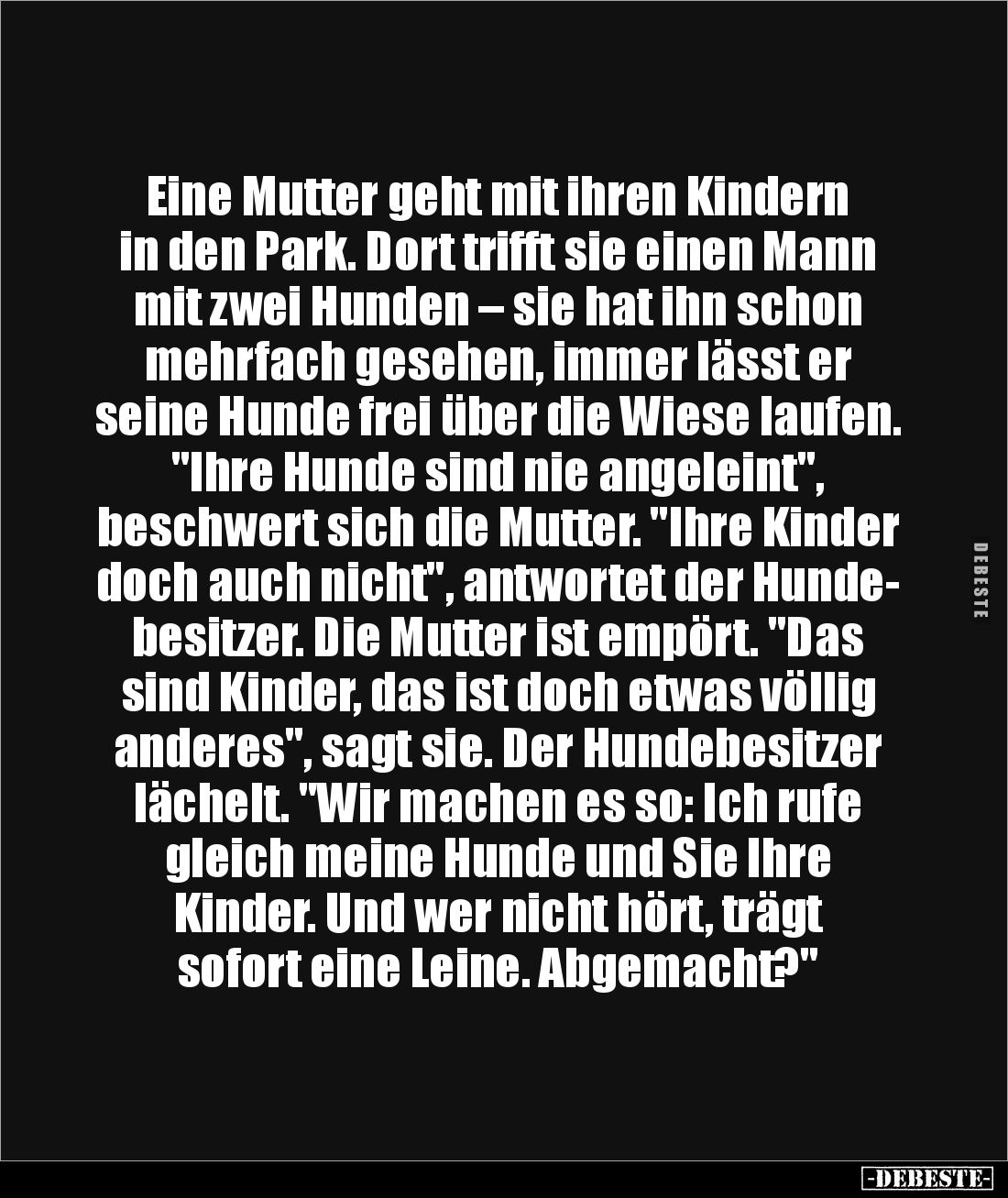 Eine Mutter geht mit ihren Kindern in den Park. Dort trifft sie einen Mann mit zwei Hunden – sie hat ihn schon mehrfach gesehen, immer lässt er seine Hunde frei über die Wiese laufen. "Ihre Hunde sind nie angeleint", beschwert sich die Mutter. "Ihre Kinder doch auch nicht", antwortet der Hunde- besitzer. Die Mutter ist empört. "Das sind Kinder, das ist doch etwas völlig anderes", sagt sie. Der Hundebesitzer lächelt. "Wir machen es so: Ich rufe gleich meine Hunde und Sie Ihre Kinder. Und wer nicht hört, trägt sofort eine Leine. Abgemacht?"