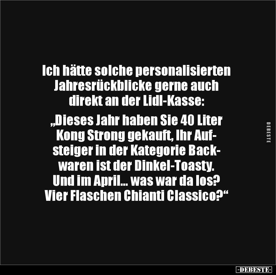 Ich hätte solche personalisierten Jahresrückblicke gerne auch direkt an der Lidl-Kasse: „Dieses Jahr haben Sie 40 Liter Kong Strong gekauft, Ihr Auf- steiger in der Kategorie Back- waren ist der Dinkel-Toasty. Und im April… was war da los? Vier Flaschen Chianti Classico?“