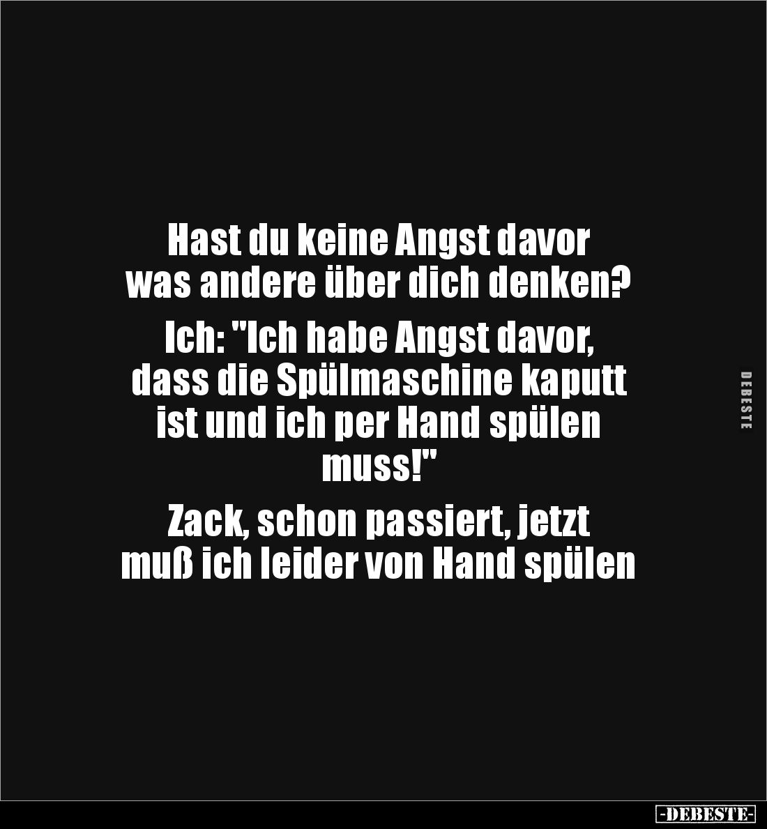 Hast du keine Angst davor was andere über dich denken? Ich: "Ich habe Angst davor, dass die Spülmaschine kaputt ist und ich per Hand spülen muss!" Zack, schon passiert, jetzt muß ich leider von Hand spülen