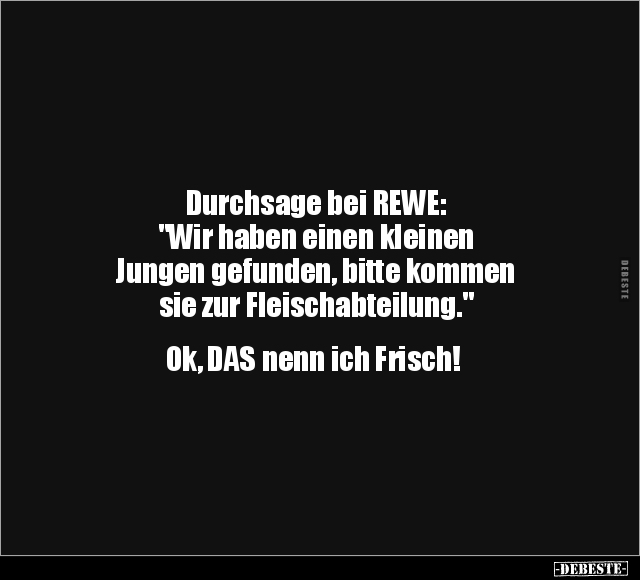 Durchsage bei REWE: "Wir haben einen kleinen Jungen gefunden, bitte kommen sie zur Fleischabteilung." Ok, DAS nenn ich Frisch!