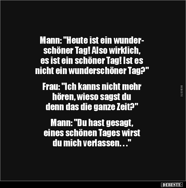 Mann: "Heute ist ein wunder- schöner Tag! Also wirklich, es ist ein schöner Tag! Ist es nicht ein wunderschöner Tag?" Frau: "Ich kanns nicht mehr hören, wieso sagst du denn das die ganze Zeit?" Mann: "Du hast gesagt, eines schönen Tages wirst du mich verlassen. . ."