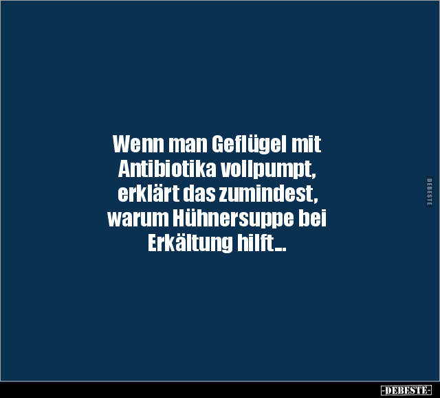 Wenn man Geflügel mit Antibiotika vollpumpt, erklärt das zumindest, warum Hühnersuppe bei Erkältung hilft...