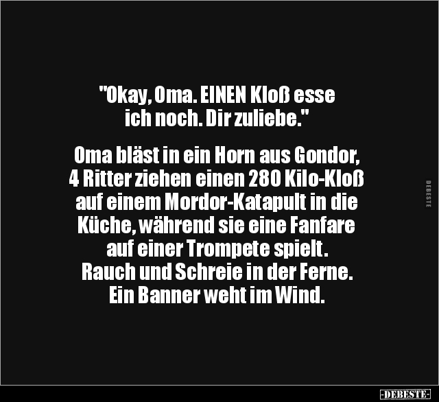 "Okay, Oma. EINEN Kloß esse ich noch. Dir zuliebe." Oma bläst in ein Horn aus Gondor, 4 Ritter ziehen einen 280 Kilo-Kloß auf einem Mordor-Katapult in die Küche, während sie eine Fanfare auf einer Trompete spielt. Rauch und Schreie in der Ferne. Ein Banner weht im Wind.