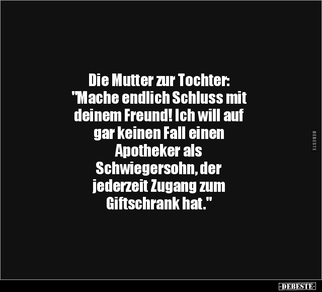 Die Mutter zur Tochter: "Mache endlich Schluss mit deinem Freund! Ich will auf gar keinen Fall einen Apotheker als Schwiegersohn, der jederzeit Zugang zum Giftschrank hat."