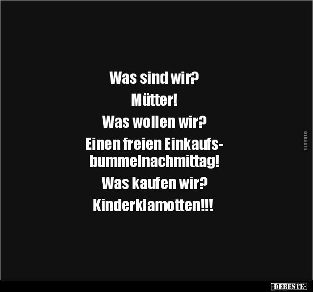 Was sind wir? Mütter! Was wollen wir? Einen freien Einkaufs- bummelnachmittag! Was kaufen wir? Kinderklamotten!!!