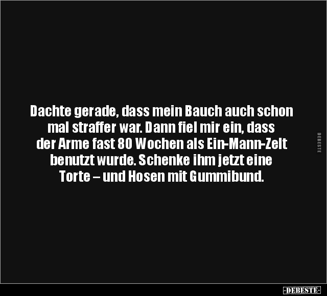 Dachte gerade, dass mein Bauch auch schon mal straffer war. Dann fiel mir ein, dass der Arme fast 80 Wochen als Ein-Mann-Zelt benutzt wurde. Schenke ihm jetzt eine Torte – und Hosen mit Gummibund.